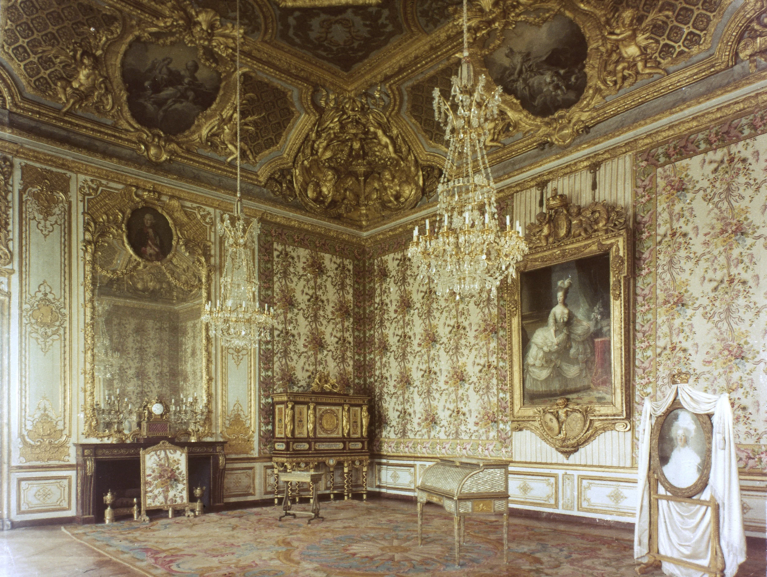 The picture above shows the room only after the first phase of post-WWII restorations, after reproductions of the exquisite 18th century silk wall hangings were re-woven in Lyon using the original patterns. In this 1955 image, we see a period copy of the famous 1778 portrait of the Queen by Elisabeth Vigée-Lebrun (the original of which is now in the Vienna Kusnthistorisches museum) which fills the empty bed alcove. The unfinished 1791 Kucharski portrait of the queen is displayed on an easel in the room for post-war museum visitors to compare to the Vigée in an evocative “before and after” display. The firescreen by Jean-Baptiste Claude Sené (1787) was returned to the Château only in 1939, the jewel chest by Schwerdfeger was transferred back to the chateau in 1933. Another piece on display associated with Marie Antoinette is the famous mother-of-pearl desk by Jean Henri Riesner made for the Palace of Fontainebleau — but the State Bed and bois doré guard-rail recreated from contemporary drawings of the 18th century would not reappear until the late 1960’s, and most certainly were not there for Alexandra Feodorovna’s comfort in 1896.